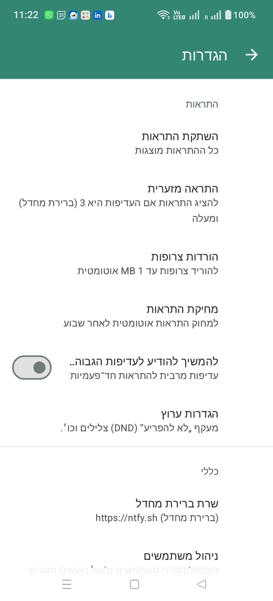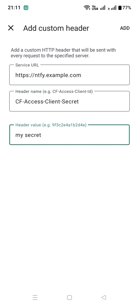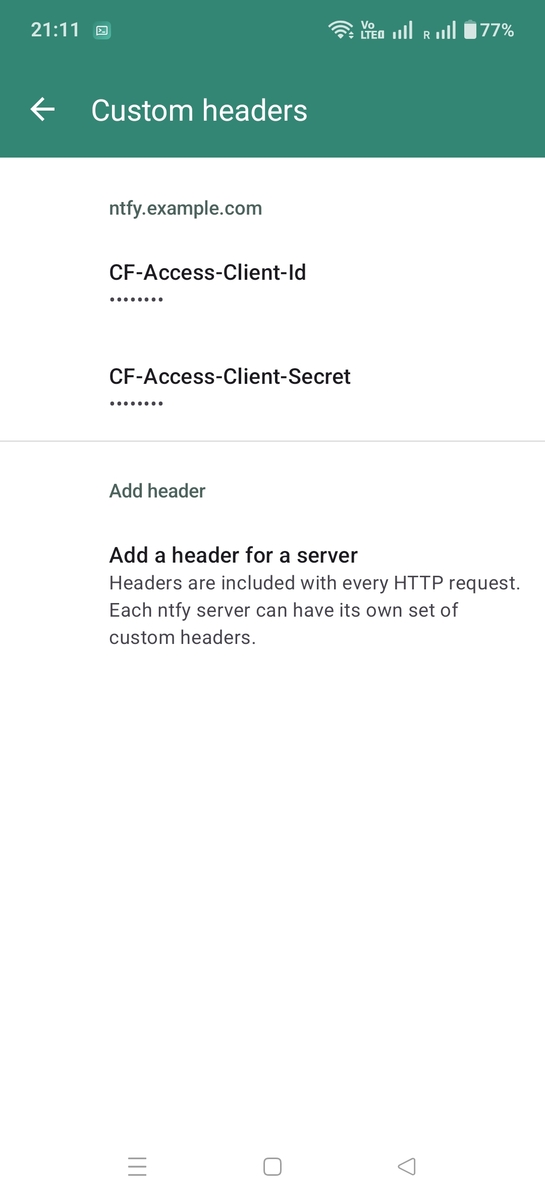 If your ntfy server is behind an authenticated proxy or tunnel (e.g., Cloudflare Access, Tailscale Funnel, or a reverse proxy with basic auth), you can configure custom HTTP headers that will be sent with every request to that server. You could set headers such as Authorization, CF-Access-Client-Id, or any other headers required by your setup. To add custom headers, go to Settings → Advanced → Custom headers.