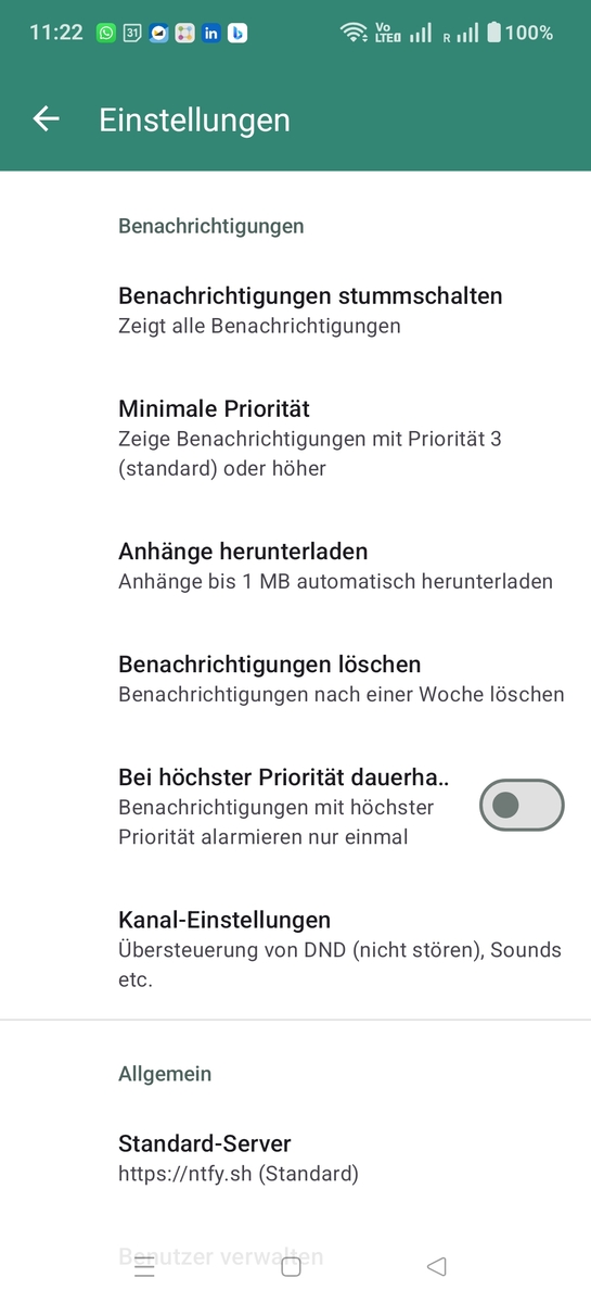 To use ntfy as a distributor, simply select it in one of the supported apps. That's it. It's a one-step installation 😀. If desired, you can select your own selfhosted ntfy server to handle messages. Here's an example with FluffyChat: