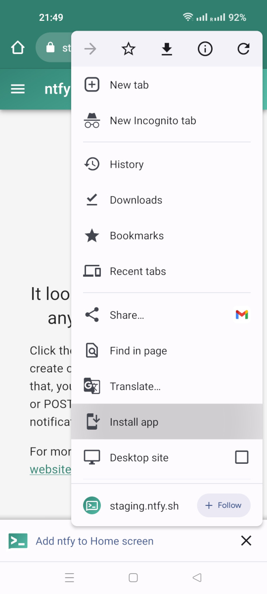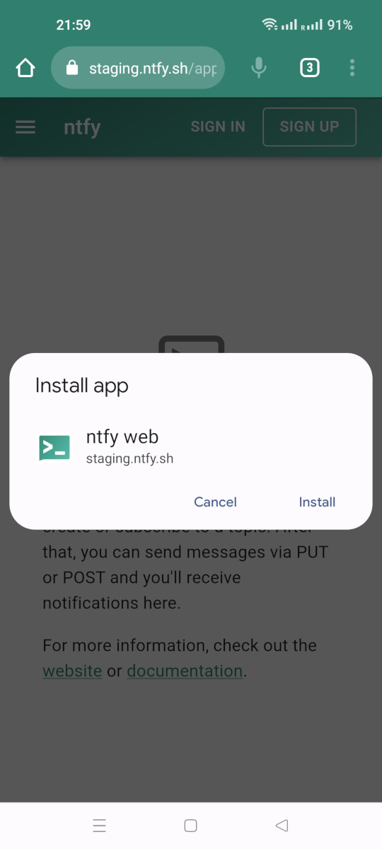 For Chrome on Android, either click the "Add to Home Screen" banner at the bottom of the screen, or select "Install app" in the menu, and then click "Install" in the popup menu. After installation, you can find the app in your app drawer, and on your home screen.