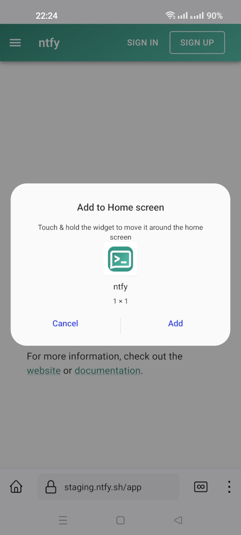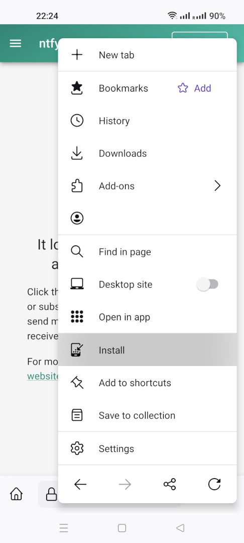 For Firefox, select "Install" in the menu, and then click "Add" to add an icon to your home screen: