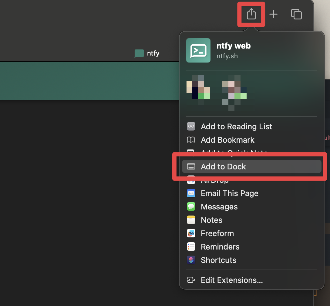 To install and register the web app via Safari, click on the Share menu and click Add to Dock. You need to be on macOS Sonoma (14) or higher.