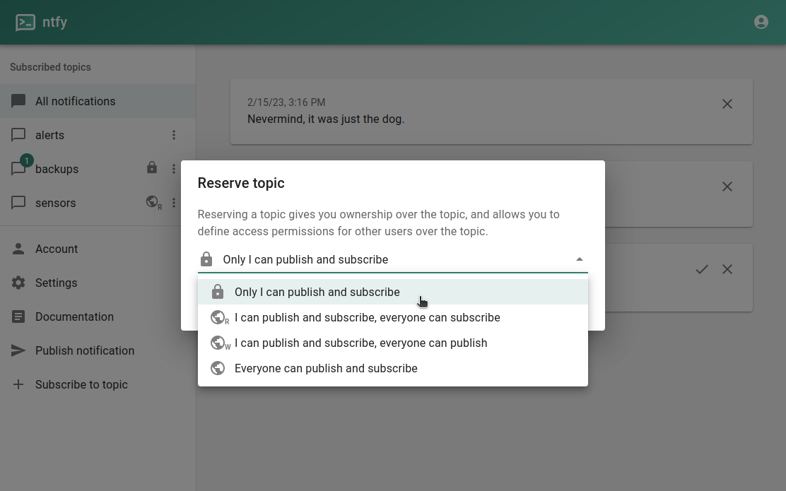 The web app lets you subscribe and publish messages to ntfy topics. For ntfy.sh, the web app is available at ntfy.sh/app. To subscribe, simply type in the topic name and click the Subscribe button. After subscribing, messages published to the topic will appear in the web app, and pop up as a notification.